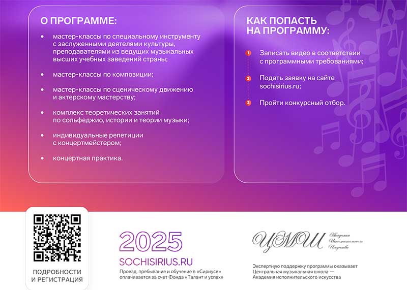 К участию в конкурсном отборе на Программу приглашаются талантливые музыканты 11-17 лет, обучающиеся в учреждениях системы музыкального образования. Прием заявок для участия в конкурсном отборе открыт до 14 февраля 2025 года (включительно).