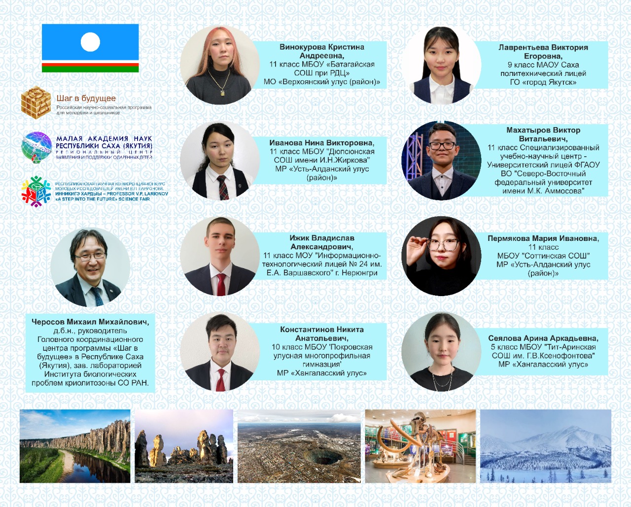Руководитель команды: Черосов Михаил Михайлович. д.б.н., руководитель Головного координационного центра программы “Шаг в будущее” в Республике Саха (Якутия), зав. лабораторией Института биологических проблем криолитозоны СО РАН.