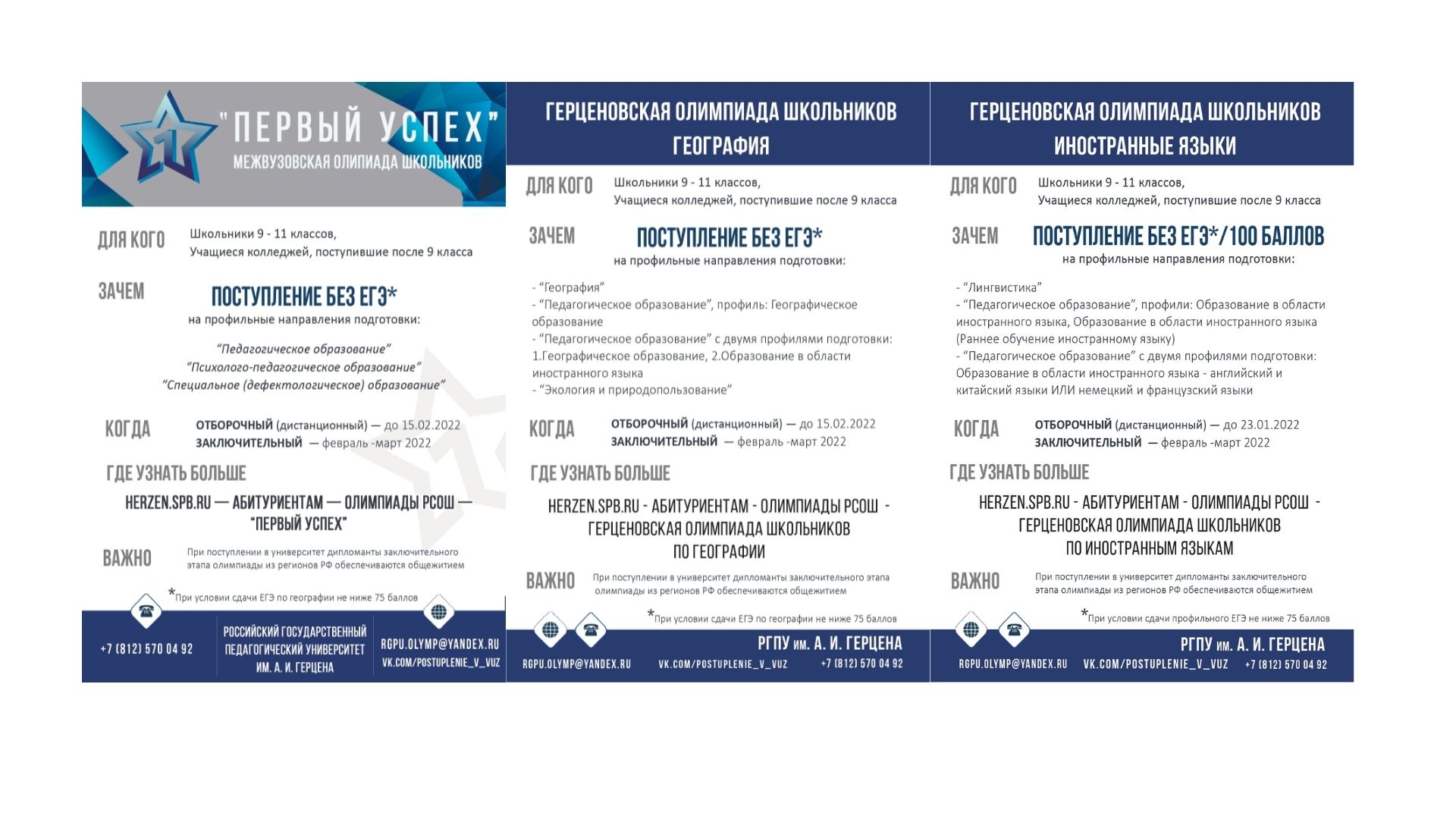 Официальная информация об олимпиадах: HERZEN.SPB.RU/ Абитуриентам / Олимпиады РСОШ (https://www.herzen.spb.ru/abiturients/olymp_for_high_school_students/ )