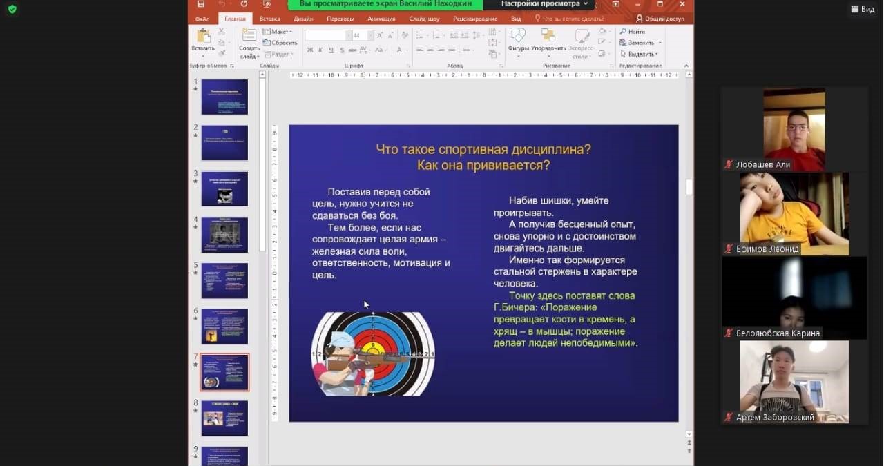 28 и 29 марта 2022 года члены сборной команды Республики Саха (Якутия) по стрельбе из лука прошли Программу с применением дистанционных технологий. Участие приняли 4 спортсмена и старший тренер сборной команды Республики Саха (Якутия) по стрельбе из лука среди девушек Спиридонова Надежда Семеновна. Программу вел Находкин Василий Васильевич – кандидат педагогических наук, доцент, заведующий кафедрой возрастной и педагогической психологии СВФУ им. М.К. Аммосова, психолог-консультант.