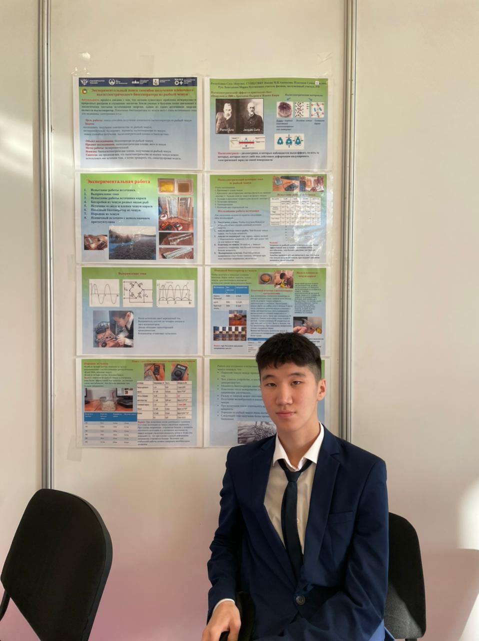 2. Платонов Семен, ученик 10 класса СУНЦ-Университетский лицей СВФУ, тема «Экспериментальный поиск способов получения пленочного пьезоэлектрического биогенератора из рыбьей чешуи».