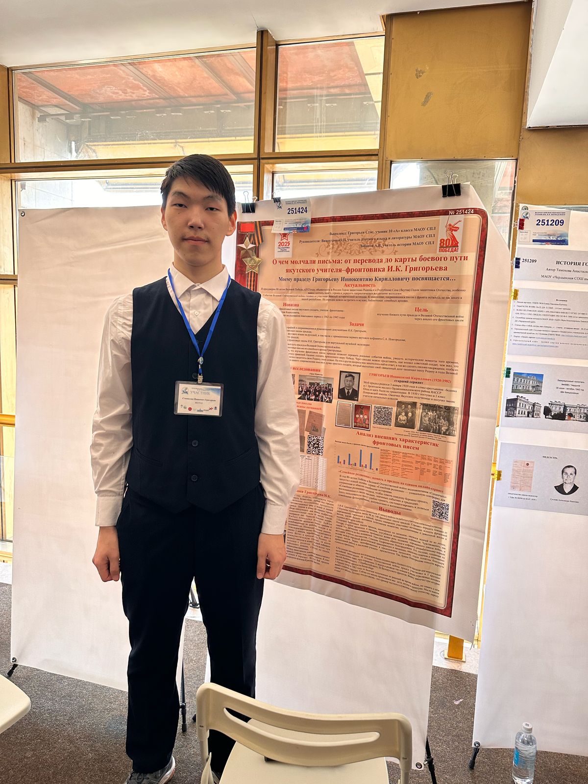 - Григорьев Станислав, 10 класс МАОУ «Саха политехнический лицей», научные руководители - Винокурова О.П., учитель русского языка и литературы, Лобанов А.В., учитель истории и обществознания, тема «О чем молчали письма: от перевода писем до боевого пути якутского учителя-фронтовика Григорьева И.К.» - лауреат в секции «Военная история», публикация в сборнике исследовательских работ, победитель номинаций «Лучшие иллюстрационные материалы», «Лучшее представление работы», «Лучшая коллекция опубликованных материалов», грамота за большой интерес с эпистолярному жанру якутского народа.