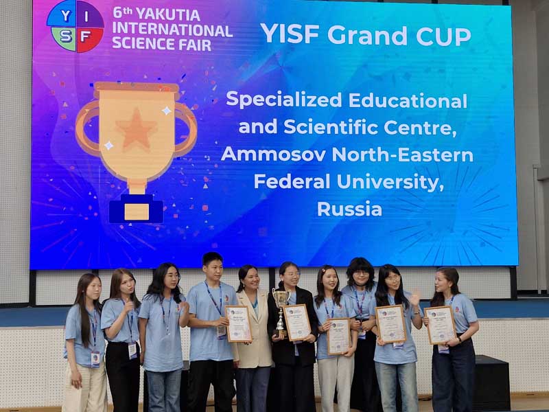 Нинель Васильевна Малышева, руководитель Департамента науки и инноваций СВФУ, вручила Большой кубок YISF команде Специализированного учебно-научного центра СВФУ!