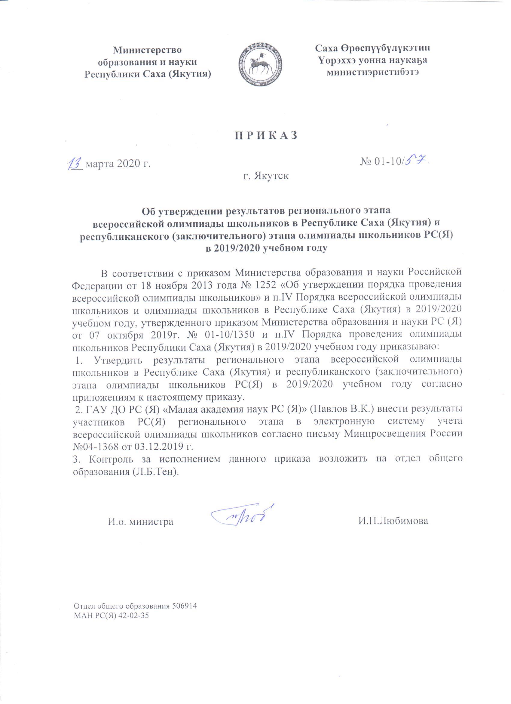 Приказ об утверждении результатов регионального этапа всероссийской олимпиады школьников в Республике Саха (Якутия) и республиканского (заключительного) этапа олимпиады школьников РС(Я) в 2019/2020 учебном году